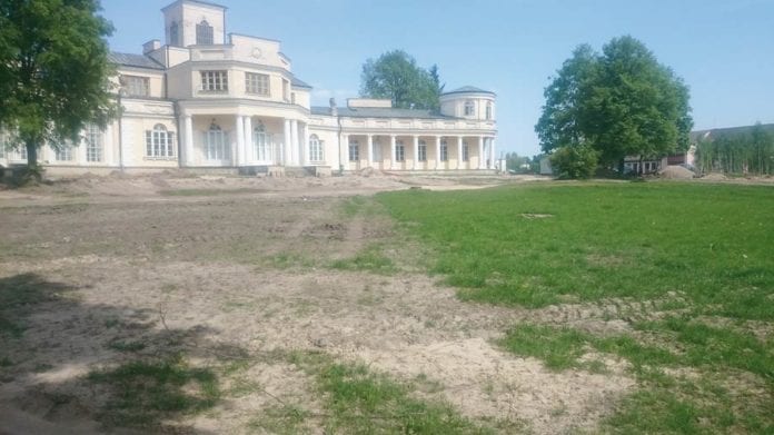 Akurat trwa apogeum ciężkich prac budowlanych. Powstał dojazd i rondo z kostki betonowej przed pałacem. Na ukończeniu jest już amfiteatr, część drzew leży wyciętych, po innych zostały jeszcze do usunięcia ogromne pniaki. Teren został rozjeżdżony przez maszyny, więc nie wygląda zbyt atrakcyjnie. I na to poskarżył nam się jeden z mieszkańców miasteczka.