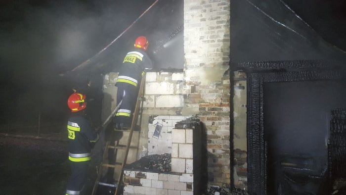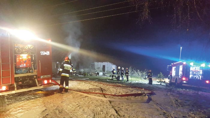 We wtorek (13 lutego) tuż po północy włodawscy strażacy otrzymali zgłoszenie o pożarze domu w Hańsku. – Do zdarzenia natychmiast wysłane zostały dwa zastępy ratowniczo – gaśnicze z JRG Włodawa oraz jeden zastęp z OSP Hańsk – mówi mł. bryg. Waldemar Makarewicz z PSP we Włodawie. – Po dojeździe na miejsce zdarzenia okazało się, że cały budynek drewniany objęty jest pożarem. Działania straży pożarnej polegały na podaniu dwóch prądów wody w celu ugaszenia pożaru. Równocześnie z prowadzeniem działań rozpoznawano możliwość zaginięcia dwóch osób, mieszkańców tego domu. Na szczęście okazało się, że osoby te znajdowały się u sąsiadów. Z poparzeniami zostały zabrane do szpitala. Na miejscu obecna była policja oraz zespół pogotowia ratunkowego. Nasze działania trwały 3 godziny. Straty wyceniono na ok. 80 tys. zł, a jako przyczynę pożaru wstępnie ustalono nieostrożne obchodzenie się ogniem w czasie rozpalania pieca centralnego ogrzewania – dodaje Makarewicz.