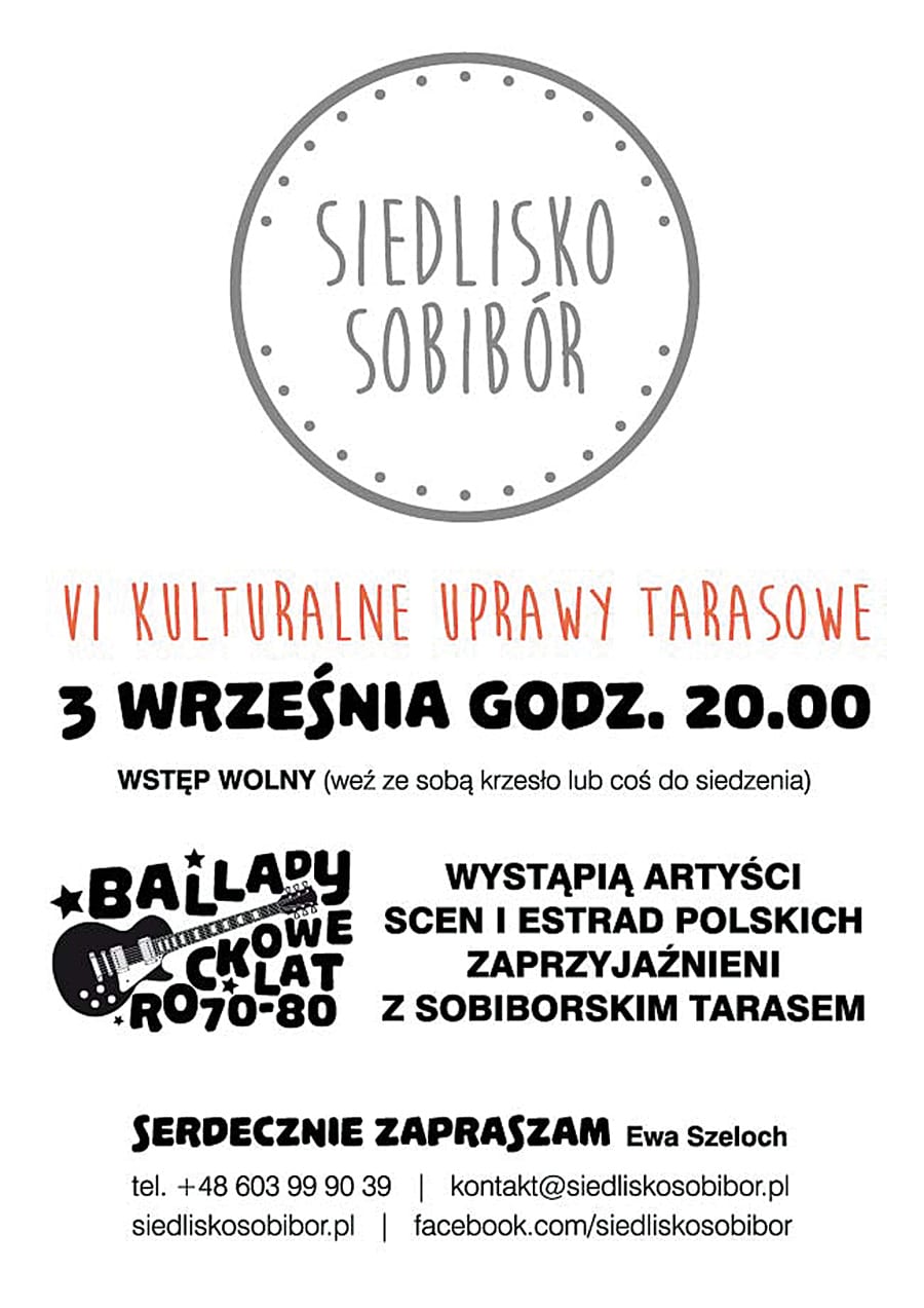 – Serdecznie zapraszam na koncert wspominkowy, najprawdopodobniej jedyny taki w tej części kraju. Na chwilę przeniesiemy się w biało-czarne czasy, które za sprawą hitów muzycznych stawały się kolorowe. Do udziału w naszych VI Kulturalnych Uprawach Tarasowych w Sobiborze zachęcają przyjaciele tarasu, wyśpiewujący w nowych aranżacjach utwory takich tuzów muzycznych jak: Krystyna Prońko, Grzegorz Markowski z Perfektem, Andrzej Zaucha, Grzegorz Ciechowski, grupa Vox czy Maanam. Nie zapomnijcie zabrać ze sobą czegoś do siedzenia, chociaż może okazać się to zbędne, gdyż nie będziecie chcieli wcale siedzieć, energia może rozsadzić taras, a wtedy będzie to już ostatni taki koncert – napisała w zaproszeniu organizatorka wydarzenia – Ewa Szeląg, właścicielka Siedliska Sobibór.