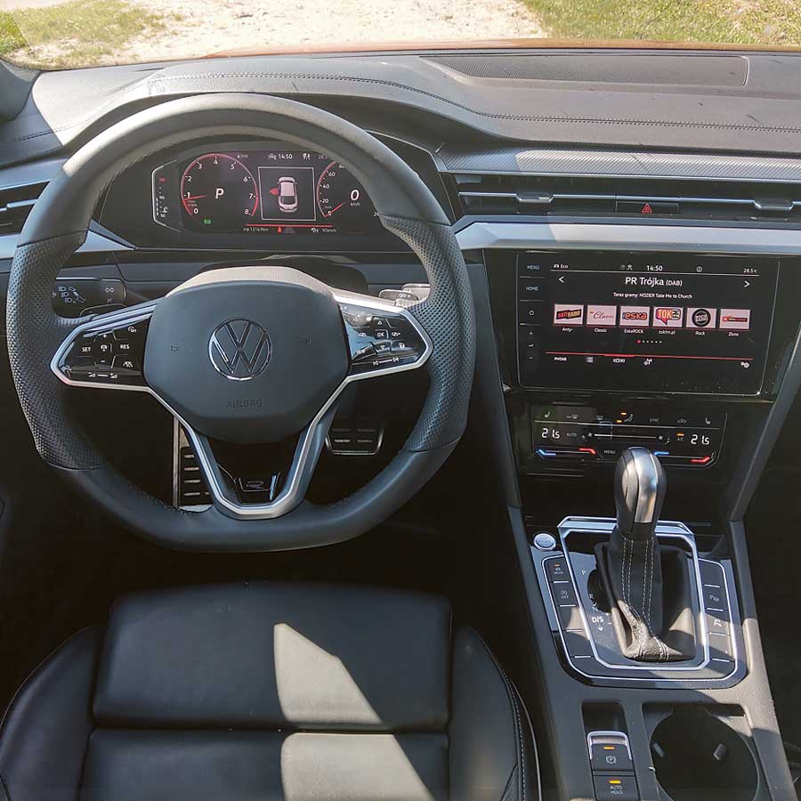 Jak jest limuzyna, to musi być na bogato. Nie inaczej jest w przypadku testowego Arteona. Na jego pokładzie znalazło się całe mnóstwo asystentów elektronicznych jazdy, oczywiście skórzana tapicerka, 20-calowe koła, elektronicznie regulowane fotele, system nagłośnienia Harman Kardon, aktywny tempomat, nawigacja, system kamer, pomocnik parkowania czy możliwość zmiany przełożeń łopatkami przy kierownicy. Tak skonfigurowane auto kosztuje ok. 250 tys. zł.