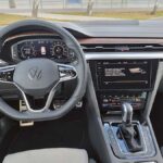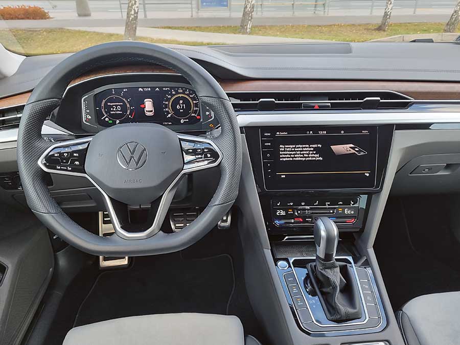 Na pokładzie Arteona znalazło się całe mnóstwo elektronicznych asystentów jazdy, skórzano-alcantarowa tapicerka, 19-calowe koła, elektronicznie regulowane fotele, aktywny tempomat, nawigacja, system kamer, pomocnik parkowania czy możliwość zmiany przełożeń łopatkami przy kierownicy.