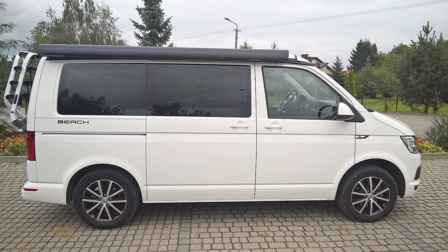 California to wielozadaniowe auto użytkowe zbudowane na bazie Volkswagena T6. W zależności od wersji i wyposażenia może być autem osobowym, małą ciężarówką, wielkim kombi czy samowystarczalnym kamperem. Do tego California nie rzuca się w oczy tak, jak większość domów na kółkach. Zajmuje tyle samo miejsca na parkingu co Multivan, a do tego oferuje nawet 5 miejsc. Stanowi więc idealne połączenie samochodu kempingowego i rodzinnego maxi-vana. Samochód ten może być nie tylko partnerem w spędzaniu czasu wolnego, uprawianiu sportów czy w indywidualnej turystyce, ale nadaje się także do załatwiania codziennych prywatnych, czy też zawodowych spraw. Deska rozdzielcza nie różni się od tej znanej z Furgona, czy Mutivana. Nie porywa więc oszałamiającym designem, ale jest niezwykle praktyczna. Materiały nie są najwyższej jakości, ale są pewnie bardziej odporne na typowe uszkodzenia kluczami czy innymi twardymi elementami. Volkswagen California występuje w trzech wersjach wyposażenia – my jeździliśmy odmianą Beach, która była wyposażona m.in. w uszczelnienie termiczne i akustyczne oraz opcjonalne ogrzewanie postojowe i rolety w każdym oknie. Jeśli jest ciepło, możemy rozłożyć dwuosobowe łóżko na dachu. Trzeba tylko pamiętać, że jego materiałowe ściany nie są wygłuszone. Z prawej strony Californii znajdziemy składaną markizę, dzięki której możemy zapewnić sobie cień podczas pikniku i usiąść wygodnie na dwóch składanych fotelach, które schowano w tylnej klapie.