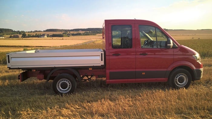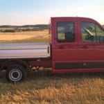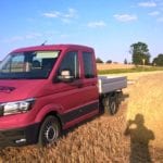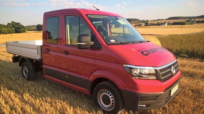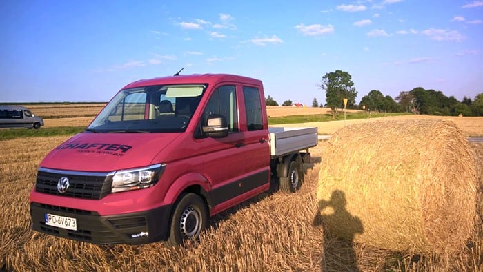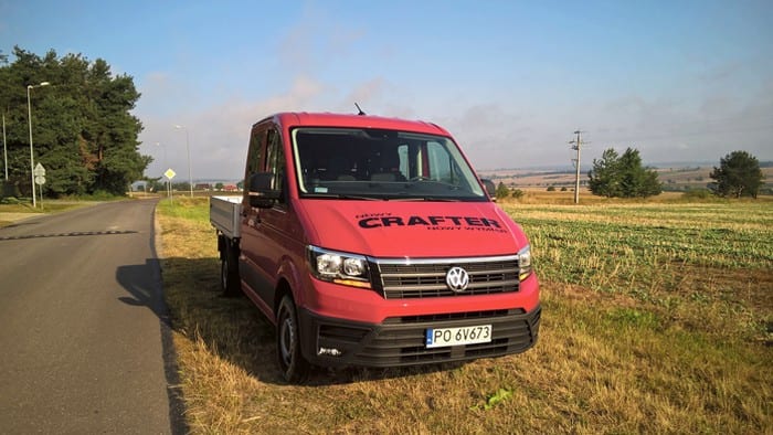 Volkswagen Crafter występuje w kilku odmianach. My testowaliśmy wersję Trendline z czterodrzwiową kabiną, skrzynią załadunkową i napędem na przód. Auto prezentuje się bardzo okazale i to nie tylko ze względu na imponujące gabaryty. Ma przód do złudzenia przypominający osobowe auta Volkswagena, chromowane wstawki i mnóstwo przetłoczeń w nadwoziu. Jednak najważniejszą rzeczą w tym samochodzie jest skrzynia załadunkowa. Dostęp do niej zapewnia bardzo sprytnie otwierana tylna burta z przymocowanym schodkiem. Na „pace” mamy dwie, zamontowane na stałe linki oraz kilka chowanych w podłodze pierścieni do zamocowania ładunku. Crafter w testowej wersji dysponował też bardzo przestronną i pojemną kabiną. Ma ona aż 7 miejsc, idealnie sprawdzi się więc na wszelkiego rodzaju budowach. Wnętrze auta jest do bólu praktyczne – zbudowane z materiałów łatwych w utrzymaniu czystości, choć twardych. Znajdziemy tu mnóstwo półek, półeczek, schowków czy uchwytów na kubki. O wygodę kierowcy dba regulowany fotel z dwoma podłokietnikami, a wszystkimi funkcjami samochodu zawiaduje się za pomocą wielkiego wyświetlacza.