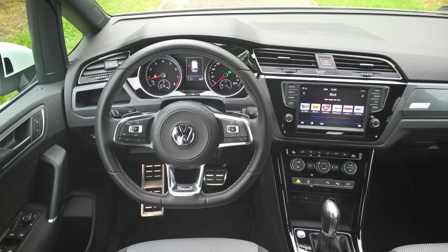 Touran to idealny przykład klasycznego minivana. Krótka, mocno opadająca maska, wielka kabina i niemal pionowo ścięta tylna klapa. Wszystko utrzymane oczywiście w charakterystycznej stylistyce wspólnej dla wszystkich modeli Volkswagena. Z przodu znajdziemy ładne lampy z obowiązkowymi LED-ami połączone stylową atrapą chłodnicy. W zderzak w kolorze nadwozia producent wkomponował czarną wstawkę z dodatkowym wlotem oraz małe światła przeciwmgłowe, których obecność dodatkowo zaznaczają „brewki”. Całkiem atrakcyjnie nasz VW prezentuje się również z profilu. Wysoko poprowadzona linia okien ze srebrną obwódką, opadająca ku tyłowi już za słupkiem B linia dachu i wielkie drzwi to jego znaki rozpoznawcze. Ten rodzinny wóz nieźle wygląda także z tyłu. Tam prym wiodą duża, uwypuklona szyba zwieńczona spojlerem ze światłem stopu oraz olbrzymie, dzielone lampy. Całość osadzona została na klasycznych, ale bardzo ładnych 18-calowych felgach. Środek Tourana to typowy Volkswagen – świetne materiały i doskonała ergonomia zderzają się w nim z zachowawczą stylistyką deski rozdzielczej. Dla większości klientów konserwatywne wnętrze bez żadnych udziwnień jest jednak zaletą. Dominującym elementem kokpitu jest panel centralny. Z jego wysokości sterować można wszystkimi ustawieniami dostępnymi w aucie. Mamy tu duży, dotykowy wyświetlacz okolony kratkami nawiewów. Tuż poniżej znajdziemy pulpit sterowania klimatyzacji, a nieco niżej klawiaturę przycisków do włączania kontroli trakcji, systemu Start&Stop, czy asystenta parkowania. Kierownica w Touranie to klasyka gatunku – trójramienna obręcz obszyta skórą, oczywiście wielofunkcyjna, jest duża, ale świetnie leży w dłoniach. Dwa analogowe zegary widoczne przez koło dzieli ciekłokrystaliczny wyświetlacz, na którym wyświetlane są wszystkie funkcje dostępne w aucie (ustawienia można zmieniać jedynie na postoju). W autach tego typu nie wygląd jest jednak najważniejszy.