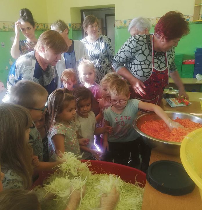 Przedszkolaki najpierw zapoznały się z walorami smakowymi i zdrowotnymi kiszonej kapusty a potem same przygotowywały ją do kiszenia. Poszatkowaną kapustę i marchew wrzuciły do przygotowanej w tym celu beczki i każdą warstwę posypywały solą. Należy wspomnieć, że nie zapominały o jej dokładnym ugnieceniu tak, aż kapusta puściła sok.