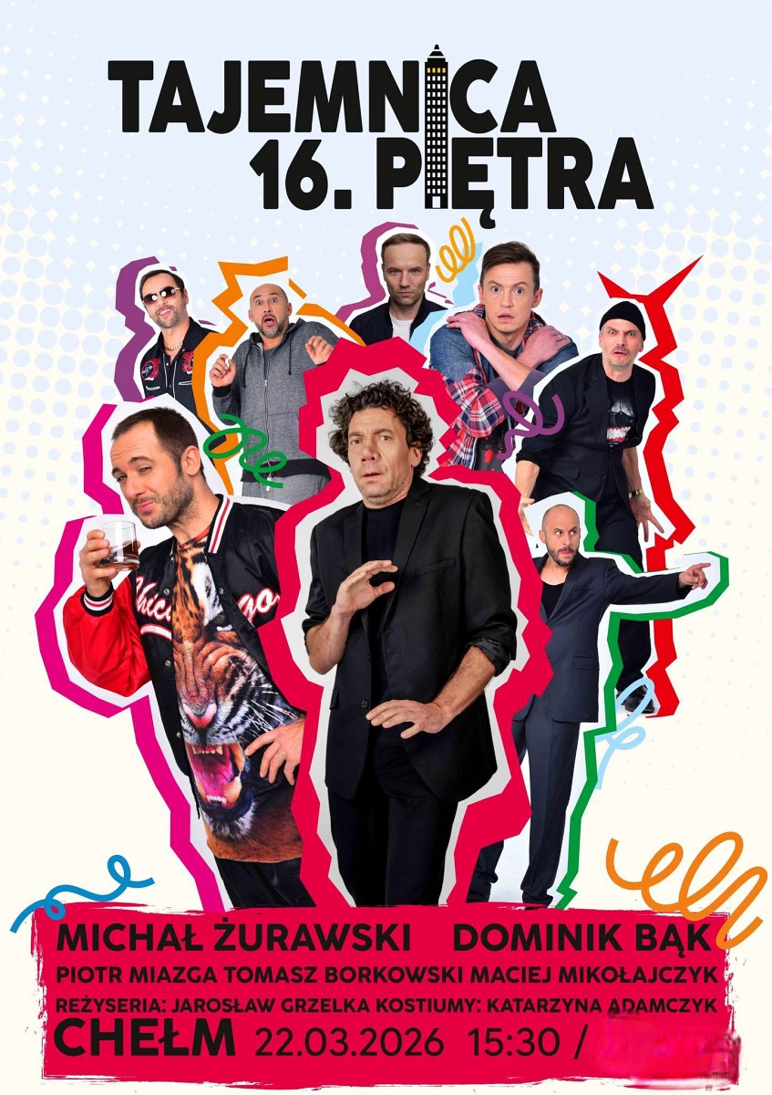 Chełmski Dom Kultury zaprasza w najbliższą niedzielę, 22 marca, na godzinę 15:30 na spektakl w gwiazdorskiej obsadzie „Tajemnica 16 piętra” z udziałem m.in. znanego chełmskiego aktora Dominika Bąka i Michała Żurawskiego.