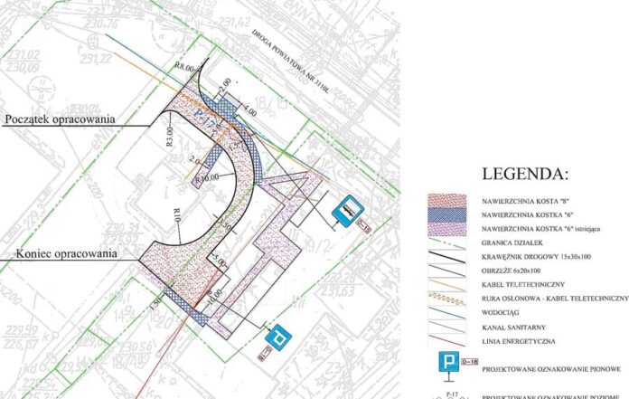 W ramach inwestycji utwardzony zostanie plac (jako objazd wokół budynku „Agronomówki”) wraz z miejscem pod nową wiatę przystankową oraz wykonane zostaną chodniki łączące parking przy sali sportowej z budynkiem ośrodka zdrowia.