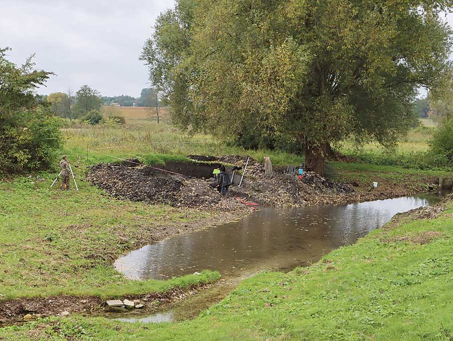 Zbadano także obrzeża „przewróconego muru”. Zdjęto w tym celu nawierzchnię układanych płaskich kamieni, a w warstwie mokrego czarnego zglinionego iłu znajdowały się konstrukcje z obrabianego drewna tj. duże belki, deski, a także wiele cegieł. Częściowo eksplorowano obiekt, ale prace te utrudniał naukowcom stale podnoszący się poziom wody (druhowie z OSP gminy Chełm pomagali archeologom, na bieżąco odprowadzając wodę do zlewni). Z kolei w zlewni źródeł przy przepuście na południowym brzegu znaleziono w wodzie kilka kamieni ze śladami zaprawy oraz duży detal kamienny z pozostałościami zaprawy wapiennej – być może nadproże lub próg. Natrafiono tu także na inne kamienie ze śladami zaprawy.