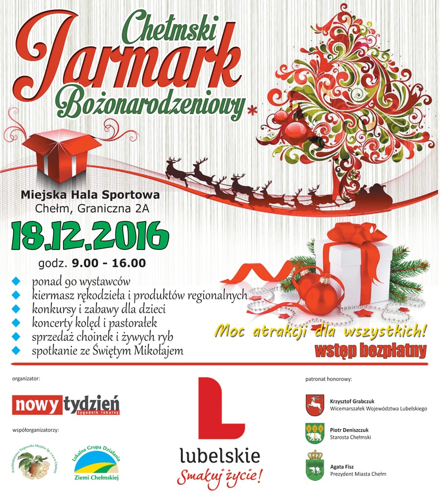 Smakowicie pachnący, roztaczający świąteczną aurę, z bożonarodzeniowymi dźwiękami i kulinarnymi smakami. Taki będzie wielki Jarmark Bożonarodzeniowy organizowany przez redakcję „Nowego Tygodnia”! Zapraszamy już w najbliższą niedzielę (18 grudnia) do chełmskiej hali sportowej. Czekać będzie na Was blisko stu wystawców z naszego regionu! Będą pachnące choinki, bożonarodzeniowe przysmaki, świeże ryby i wszystko, co tworzy niepowtarzalny klimat Świąt Bożego Narodzenia.
