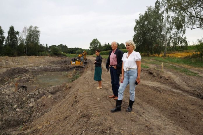 Wójt gminy Leśniowice Joanna Jabłońska wraz z zastępcą Martą Sulej-Dobosz, kierownikiem Referatu Rolnictwa Dariuszem Zalewą, projektantem Józefem Mazurkiem oraz Henrykiem Radeckim odwiedzili teren przebudowy zbiornika retencyjnego w Leśniowicach.