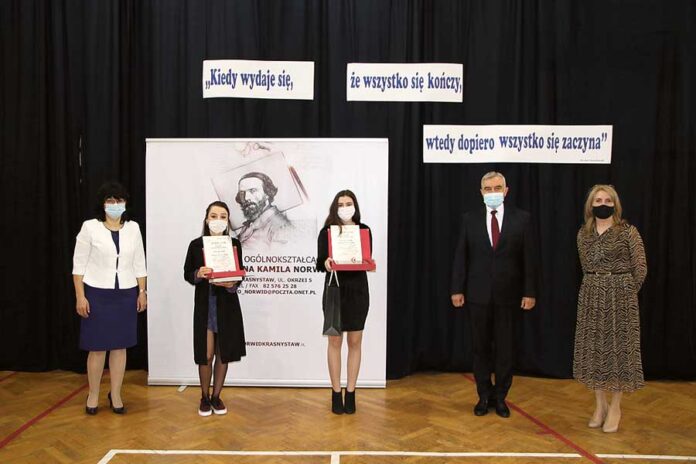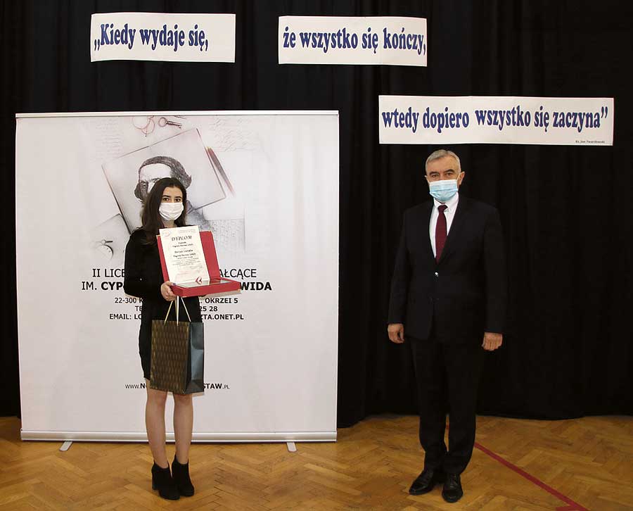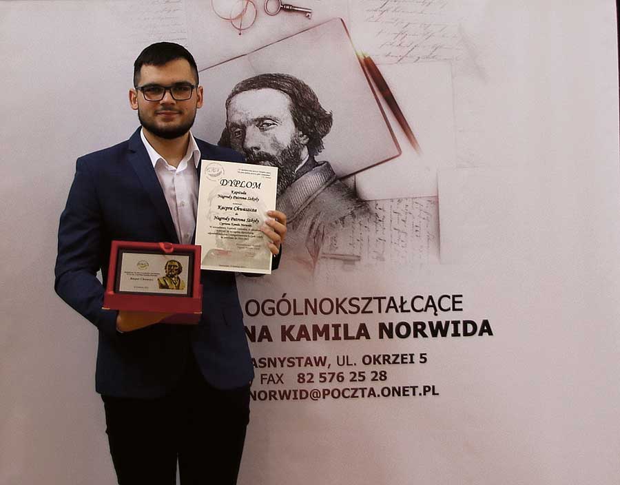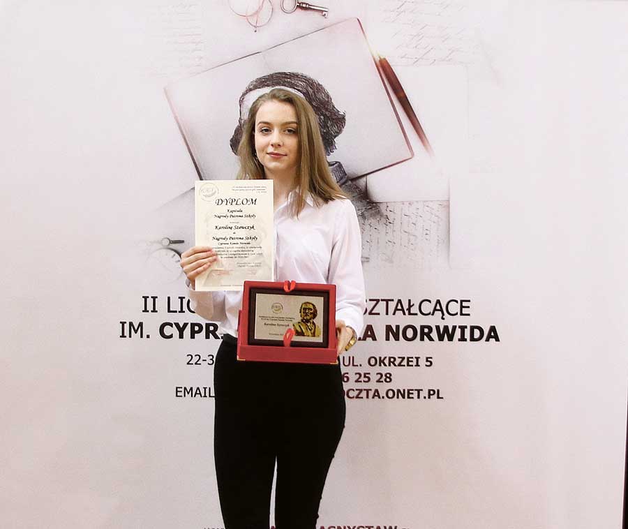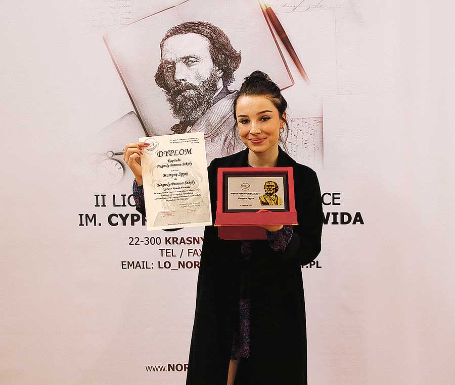 Dzięki kształceniu w „Norwidzie” mogłam nie tylko zdobyć odpowiednią wiedzę, ale także kultywować i rozwijać wartości, którymi szkoła się szczyci. Myślę, że nominacja do Nagrody Patrona Szkoły była docenieniem mojej ciężkiej pracy oraz zaangażowania w życie społeczne powiatu krasnostawskiego. Jest mi ogromnie miło oraz serdecznie dziękuje za tak wielkie wyróżnienie. (k)