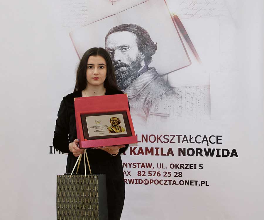 Laureatka Nagrody Patrycja Szuryga dziękując za otrzymaną nagrodę powiedziała: – Każdy z nas pracuje na własny rachunek i ma przed sobą drogę, którą wybiera podczas każdej decyzji życiowej. Jedną z takich decyzji był wybór szkoły o głębokich wartościach religijnych, patriotycznych i społecznych. Przyswajanie wiedzy w liceum jest doskonałą przepustką do dalszej drogi ku zdobyciu wymarzonego zawodu. W trakcie trzech lat spędzonych w „Norwidzie” poszerzałam swoje zainteresowania oraz pasje.