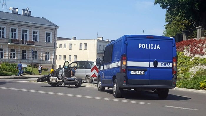 Nie zauważył jednośladu i wjechał na skrzyżowanie. Auto skasowało motocykl, a jego kierowca ma liczne obrażenia.