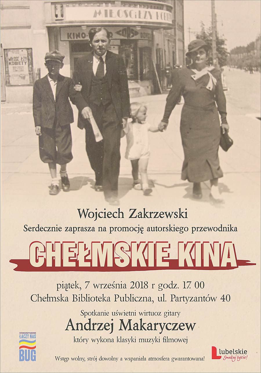 – Projekcje filmowe w Chełmie mają długą i ciekawą historię. Aby ją przypomnieć, zabiorę was na wycieczkę po mieście śladami chełmskich kin. Będzie to opowieść o miejscach, których już nie ma – „Syrenie”, „Oazie”, „Wersalu”, „Tęczy”, „Słońcu”, „Polonii” i „Bałtyku”, oraz o tych, które już kinami nie są, tak jak „Strzelec” i „Corso” – zapowiada Wojciech Zakrzewski. Autor przewodnika zapowiada, że ci, co przybędą na imprezę, poznają „chełmskie zaułki i podwórka, gdzie mieszkańcy oglądali filmy pod chmurką”. – Przejdziemy ulicami i opowiemy o czasach, w których świątynie stawały się kinami, a kina świątyniami. Będzie to także wyprawa w świat niemego kina, małych zadymionych sal, w których za 20 groszy przed migoczącym ekranem spędzały wieczór całe rodziny – mówi Zakrzewski. Spotkanie ubarwi recital gitarowy Andrzeja Makaryczewa, który wykona klasyki muzyki filmowej. Wstęp wolny.