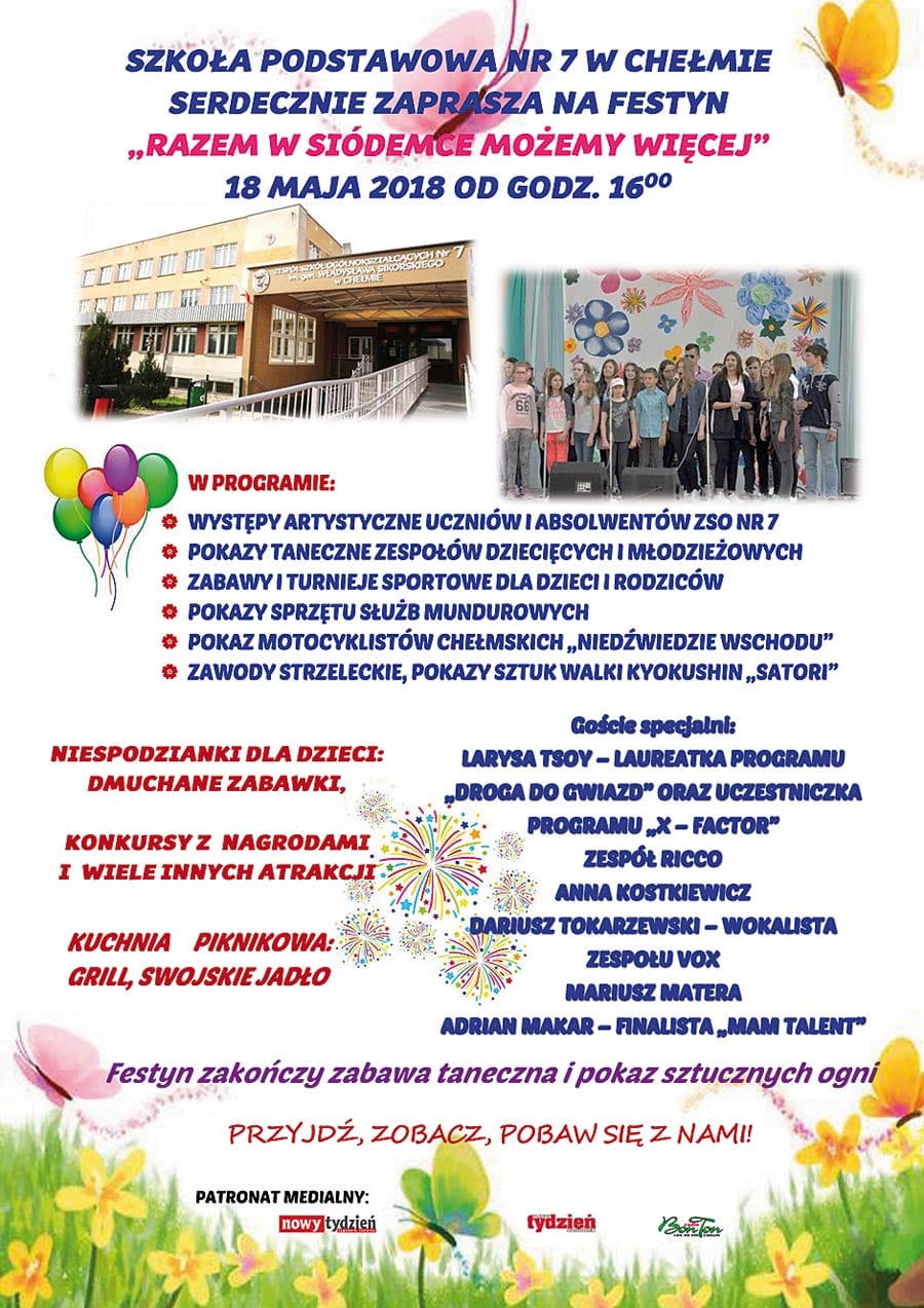 Impreza pod nazwą „Razem w Siódemce możemy więcej” co roku gromadzi przed Szkołą Podstawową nr 7 przy ul. Synów Pułku 15 już nie tylko uczniów, absolwentów „Siódemki”, ale gości z całego Chełma. Nic dziwnego z każdym rokiem program festynu jest coraz bogatszy, a na scenie występują znane gwiazdy. W piątek, 18 maja, kolejna edycja festynu. Impreza rozpocznie się o godzinie 16.00. Oprócz występów artystycznych będą pokazy sprzętu służb mundurowych, pokazy akrobatyczne, zawody strzeleckie, zabawy i konkursy z nagrodami.