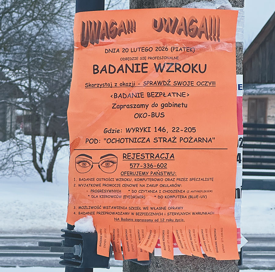 Na słupach i przystankach wszystkich gmin w powiatach chełmskim, krasnostawskim i włodawskim pojawiły się ostatnio ogłoszenia zapraszające na bezpłatne badania wzroku w mobilnym Oko-Busie. Wszystkich, którzy zdecydują się z nich skorzystać, uczulamy, by postawionej tam diagnozy nie traktować jak wyrocznię, a akcji nie finansuje NFZ.