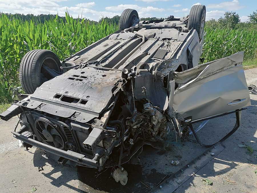 Zgłoszenie o dachowaniu w Poczekajce w gminie Ruda-Huta dyżurny policji odebrał w poniedziałek po południu (około godz. 14:30, 25 lipca). Skierowany na miejsce patrol ocenił, że kierowca nie stworzył zagrożenia – jechał sam, a po kolizji auto wylądowało poza drogą. Obyło się bez mandatu. (pc, fot. kpt. Paweł Krystynek)
