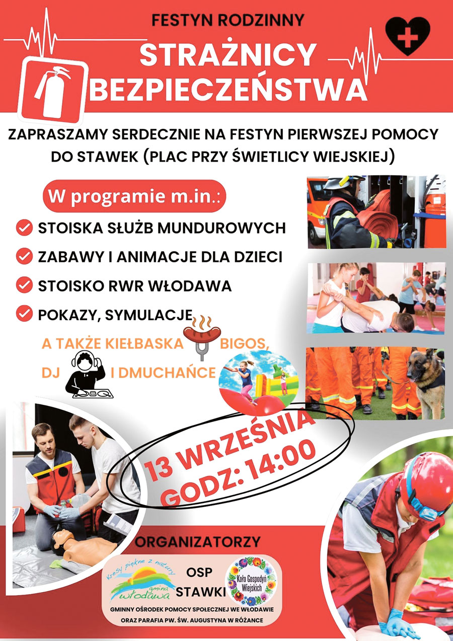 W sobotę, 13 września o godz. 14:00 w Stawkach (gmina Włodawa) odbędzie się wyjątkowe wydarzenie dla całych rodzin. Mowa o pikniku Strażnicy Bezpieczeństwa! To doskonała okazja, aby spędzić aktywnie czas, poznać pracę służb mundurowych i po prostu dobrze się bawić.