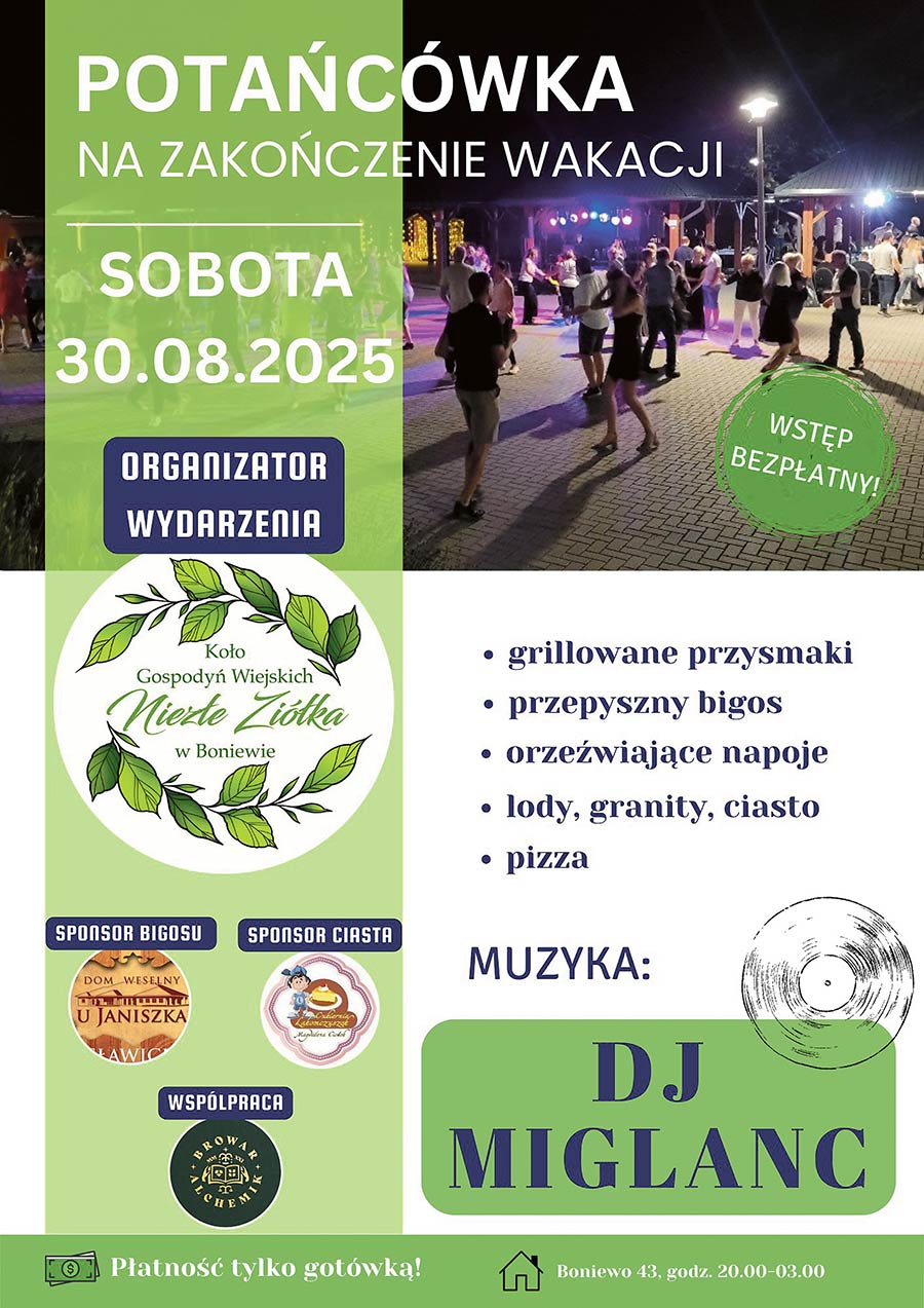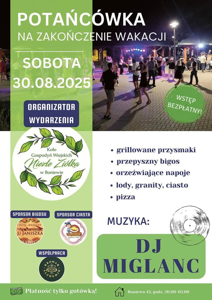 W sobotę 30 sierpnia, na pożegnanie wakacji, Koło Gospodyń Wiejskich „Niezłe Ziółka” z Boniewa zaprasza na potańcówkę pod gwiazdami.
