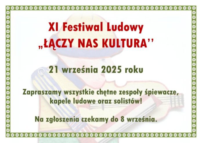 Gminny Ośrodek Kultury w Łopienniku Górnym serdecznie zaprasza do udziału w XI Festiwalu Ludowym „Łączy Nas Kultura”, który odbędzie się 21 września 2025 roku. Wydarzenie to jest doskonałą okazją do promocji i kultywowania tradycji folkloru, konfrontacji dorobku artystycznego, doskonalenia warsztatu muzycznego oraz integracji miłośników kultury ludowej.