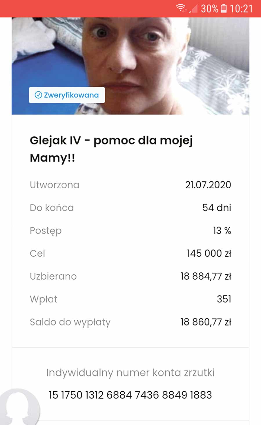 Zbiórka pieniędzy na terapię pani Beaty prowadzona jest za pośrednictwem strony internetowej https://zrzutka.pl/pokonajmy-glejaka4st. Indywidualny numer konta zrzutki: 15 1750 1312 6884 7436 8849 1883. (mo)