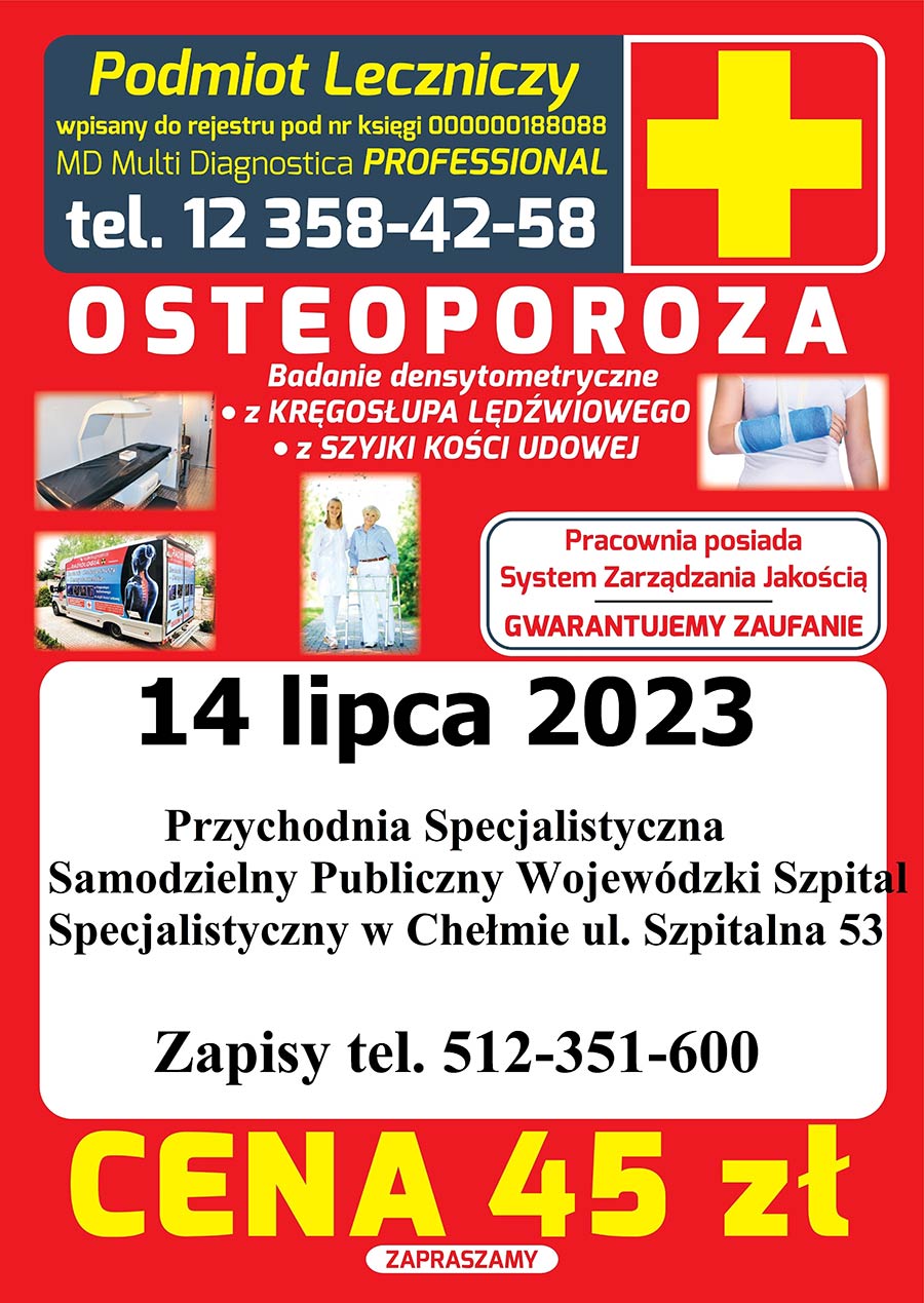 14 Lipca 2023 – CHEŁM, Przychodnia Specjalistyczna Samodzielny Publiczny Wojewódzki Szpital Specjalistyczny w Chełmie ul. Szpitalna 53, Cena 45zł
