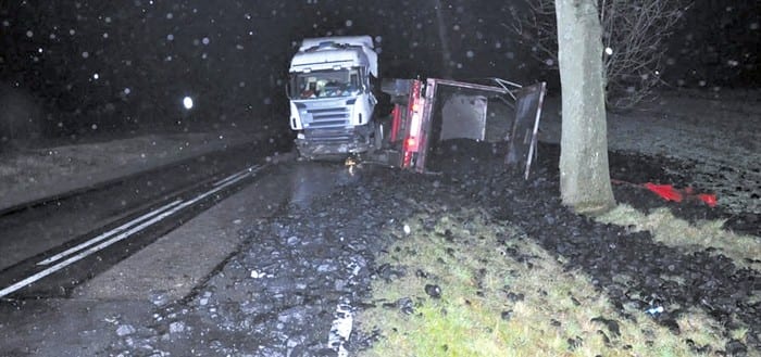 Do zdarzenia doszło we wtorek (2 stycznia), przed godziną 17. Przejeżdżając przez powiat hrubieszowski ciężarówką z naczepą wypełnioną węglem, 59-latek z gminy Chełm, na drodze wojewódzkiej nr 844, w Jankach, stracił panowanie nad pojazdem. Na łuku drogi zjechał do przydrożnego rowu. Wyglądało groźnie. Naczepa scanii przewróciła się, a cały węgiel wysypał się na jezdnię i przydrożne pola. Kierowcę wyrzuciło z kabiny. Z obrażeniami ciała mężczyzna został przetransportowany do szpitala. Jego życiu nic nie zagraża. (pc)