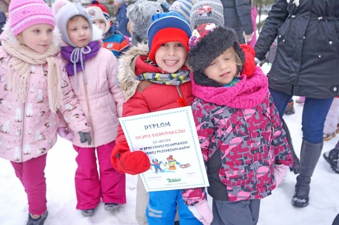 Choć na dworze lekki mrozik, maluchy – pamiętając o tym, że ruch na świeżym powietrzu to samo zdrowie – z uśmiechem uczestniczyły w sportowych zmaganiach. Wśród „przedszkolnych dyscyplin olimpijskich” znalazły się: slalom z saneczkami, bieg na czas między pachołkami, śnieżne zaprzęgi i rzut śnieżką do celu. Zimowa rywalizacja sportowa zakończyła się wręczeniem Żabkom, Smerfikom, Biedroneczkom i Misiom pamiątkowych dyplomów. Olimpiadę przygotowały: Natalia Solecka i Dorota Winiarczyk. (a)