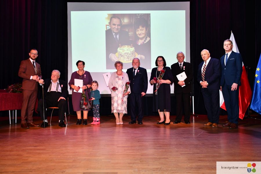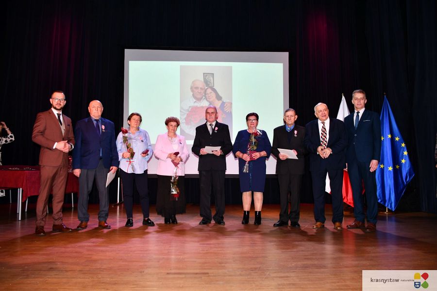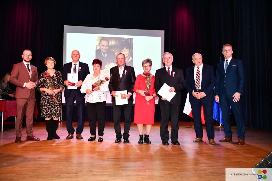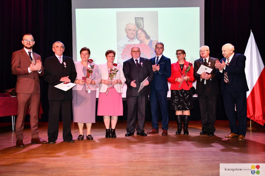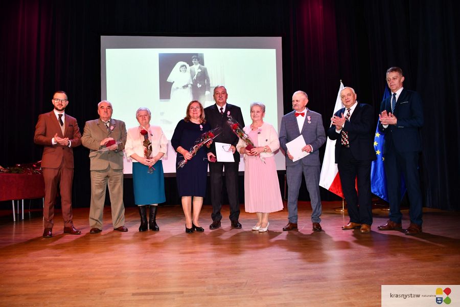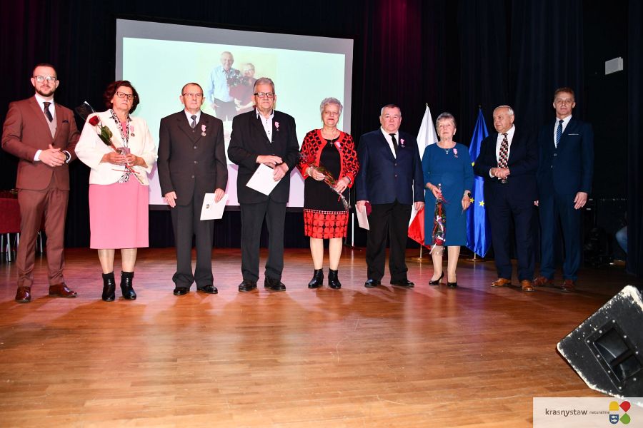 Wszyscy jubilaci zostali uhonorowani Medalami za Długoletnie Pożycie Małżeńskie przyznane przez Prezydenta RP. Na scenie KDK wręczali je: burmistrz Krasnegostawu Daniel Miciuła, starosta krasnostawski Janusz Szpak i radny Lucjan Wąsiura. Wśród gości byli również: sekretarz miasta Krasnystaw Renata Stangryciuk, wójt gminy Krasnystaw Wojciech Kowalczyk i kierownik USC w Krasnymstawie Ewa Gleń. Wydarzeniu w KDK Domu towarzyszył występ działającego przy Dziennym Domu Pomocy Społecznej w Krasnymstawie zespołu „Jesienne Promyki” pod kierunkiem Krystyny Kobylańskiej i przy akompaniamencie Ryszarda Króla.