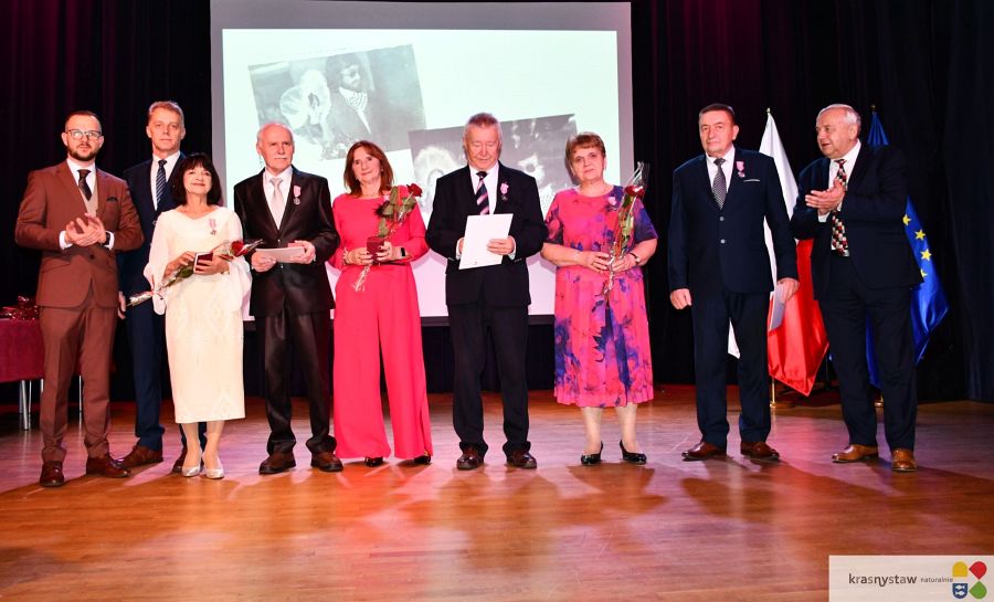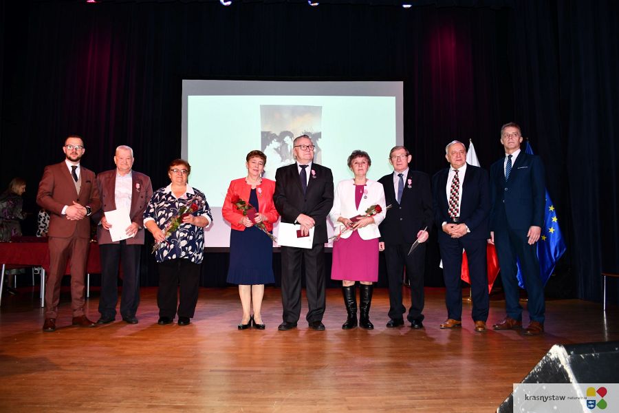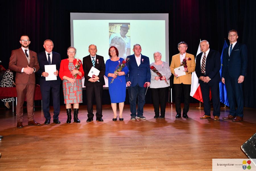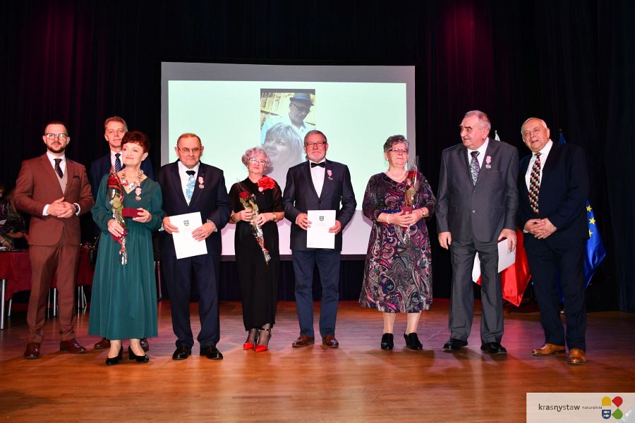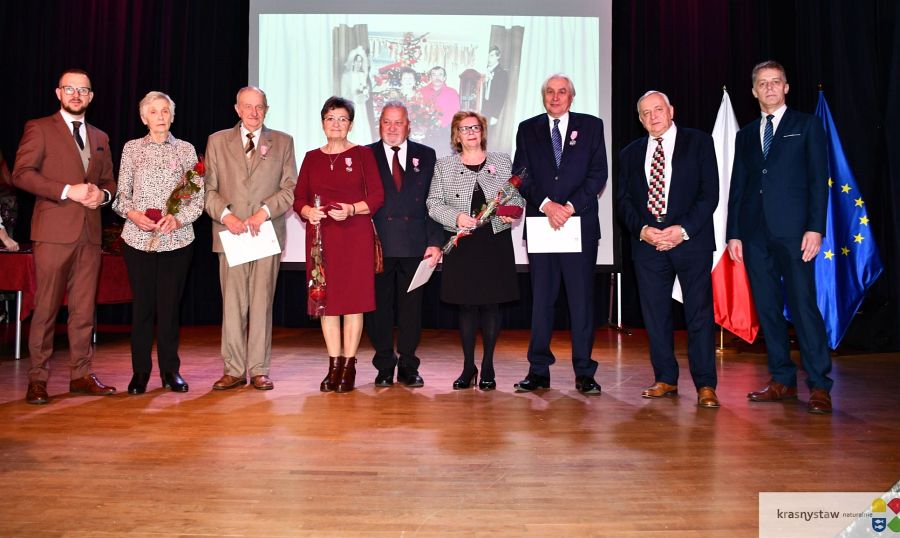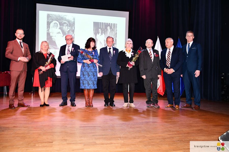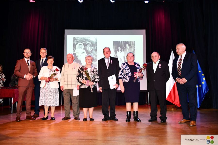 Wszyscy jubilaci zostali uhonorowani Medalami za Długoletnie Pożycie Małżeńskie przyznane przez Prezydenta RP. Na scenie KDK wręczali je: burmistrz Krasnegostawu Daniel Miciuła, starosta krasnostawski Janusz Szpak i radny Lucjan Wąsiura. Wśród gości byli również: sekretarz miasta Krasnystaw Renata Stangryciuk, wójt gminy Krasnystaw Wojciech Kowalczyk i kierownik USC w Krasnymstawie Ewa Gleń. Wydarzeniu w KDK Domu towarzyszył występ działającego przy Dziennym Domu Pomocy Społecznej w Krasnymstawie zespołu „Jesienne Promyki” pod kierunkiem Krystyny Kobylańskiej i przy akompaniamencie Ryszarda Króla.