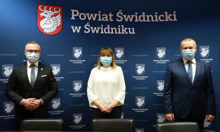 Ewa Pietrzyk, nowa dyrektor DPS w Krzesimowie, w towarzystwie starosty Łukasza Reszki (z lewej) oraz członka zarządu powiatu, Romualda Gumienniaka