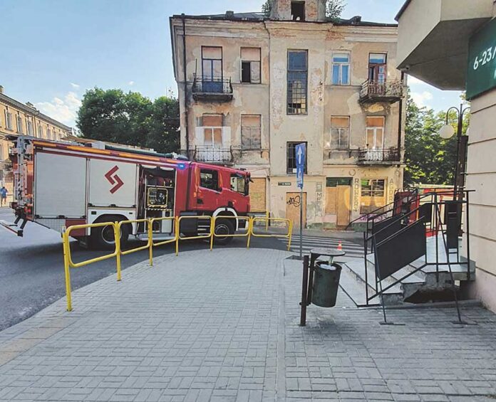 Dym, wydobywający się ze zrujnowanej kamienicy na rogu ul. Szkolnej, zauważył w sobotni wieczór (25 czerwca) przechodzień, który natychmiast wezwał pomoc.