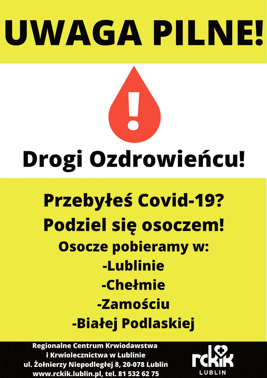 Ostatnio padały rekordy pod względem liczby hospitalizowanych pacjentów z Covid-19, będących w ciężkim stanie. Dla wielu z nich ostatnią deską ratunku jest podanie osocza od ozdrowieńców. Regionalne Centrum Krwiodawstwa i Krwiolecznictwa w Lublinie i jego oddziały, w tym chełmski, cały czas zachęcają do oddawania osocza. Zdarza się, że rodziny pacjentów dzwonią do centrów krwiodawstwa, prosząc o osocze dla swoich bliskich.