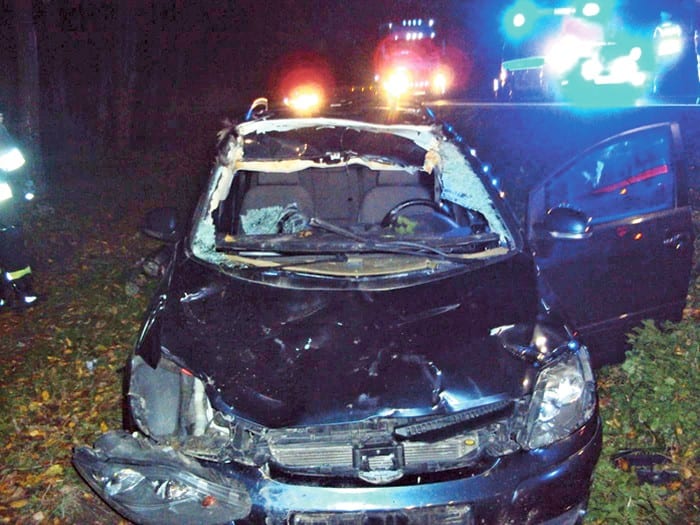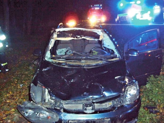 Do pierwszego zdarzenia doszło w Wólce Orłowskiej (gmina Izbica). W nocy z soboty na niedzielę (7/8 października) drogą krajową nr 17 jechał tirem kierowca z Ukrainy. Tuż przed 23.00 pod ciężarówkę nagle wbiegł spory łoś. – Siła uderzenia była bardzo duża, zwierzę niestety zginęło na miejscu – mówi Piotr Wasilewski, rzecznik krasnostawskiej policji. Kierowcy tira nic się nie stało, mężczyzna był trzeźwy. Przez kilka godzin przejazd siedemnastką na trasie Krasnystaw – Zamość był utrudniony. Trzy dni później do podobnego wypadku doszło w Łopienniku Nadrzecznym. 10 października ok. godz. 18.30 łoś wszedł pod rozpędzonego Volkswagena Golfa. Niestety jadący osobowym autem mieszkaniec Krasnegostawu nie miał szans wyhamować. – I tu zwierzę zginęło na miejscu. Kierowca z podejrzeniem urazu głowy trafił do szpitala, ale okazało się, że nic poważnego mu się nie stało – informuje Wasilewski. Policja apeluje do kierowców o rozwagę i rozsądek za kółkiem. Zwłaszcza podczas jazdy przez las. W okresie jesienno-zimowym zwierzęta, zwłaszcza sarny i łosie, migrują. (kg, fot. Straż Pożarna Krasnystaw)