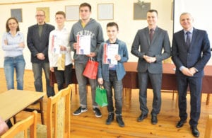 Nagrody laureatom wraz z gratulacjami wręczał wicestarosta Adam Panasiuk w asyście dyrektora ZSZ nr 1 i II LO – Eugeniusza Omelczuka. (-)