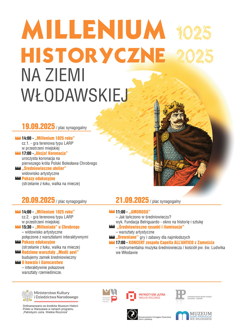 Muzeum – Zespół Synagogalny we Włodawie zaprasza na wyjątkowe wydarzenie historyczne, które przeniesie mieszkańców i gości w czasy pierwszego koronowanego władcy Polski. Projekt „Millenium historyczne na Ziemi Włodawskiej”, ma na celu upamiętnienie koronacji Bolesława Chrobrego z 1025 roku oraz podkreślenie znaczenia polskiej przeszłości i dziedzictwa narodowego.